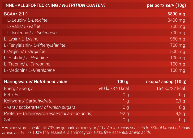 I Amino Rush är de essentiella aminosyrorna i fri form vilket ger fördelen att de mycket snabbt absorberas och transporteras ut till de arbetande musklerna. Tre fjärdedelar av aminosyrorna utgörs av grenade aminosyror (BCAA), med en majoritet L-leucin. L-leucin är den aminosyra som har störst betydelse för din muskeltillväxt och återhämtning. Arginin stimulerar ett ökat blodflöde genom att främja syntesen av kväveoxid, vilket ger en kraftigare muskelpump.