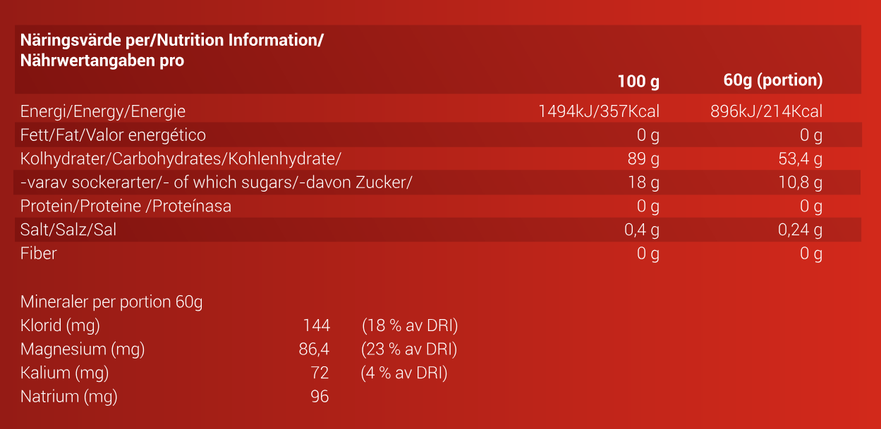 Energy Booster ersätter inte bara förbrukade kolhydrater utan även elektrolyter. När man förlorar mycket vätska under t.ex. hård fysisk aktivitet eller varma dagar så tappar man samtidigt elektrolyter. Energy Booster innehåller kalium, natrium och magnesium vilket gör att du upprätthåller kroppens elektrolytbalans även i de mest krävande situationer.